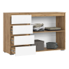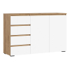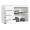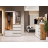 Фасады с вертикальной фрезеровкой без лицевой фурнитуры не перегружают интерьер. На поверхности можно расставить предметы декора, осветительные приборы или памятные фотографии в рамках.