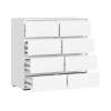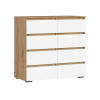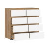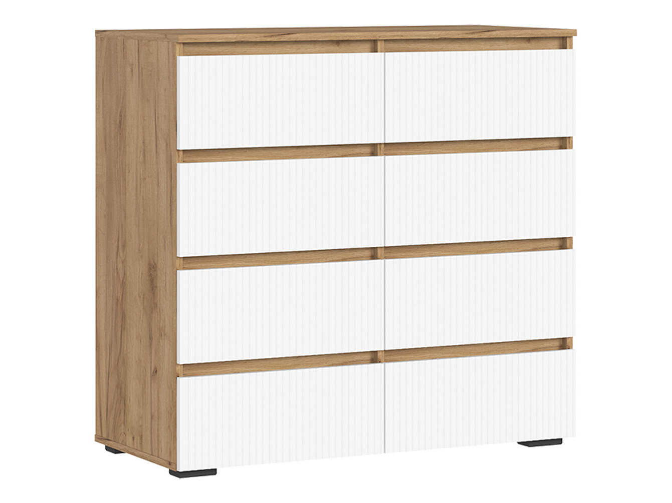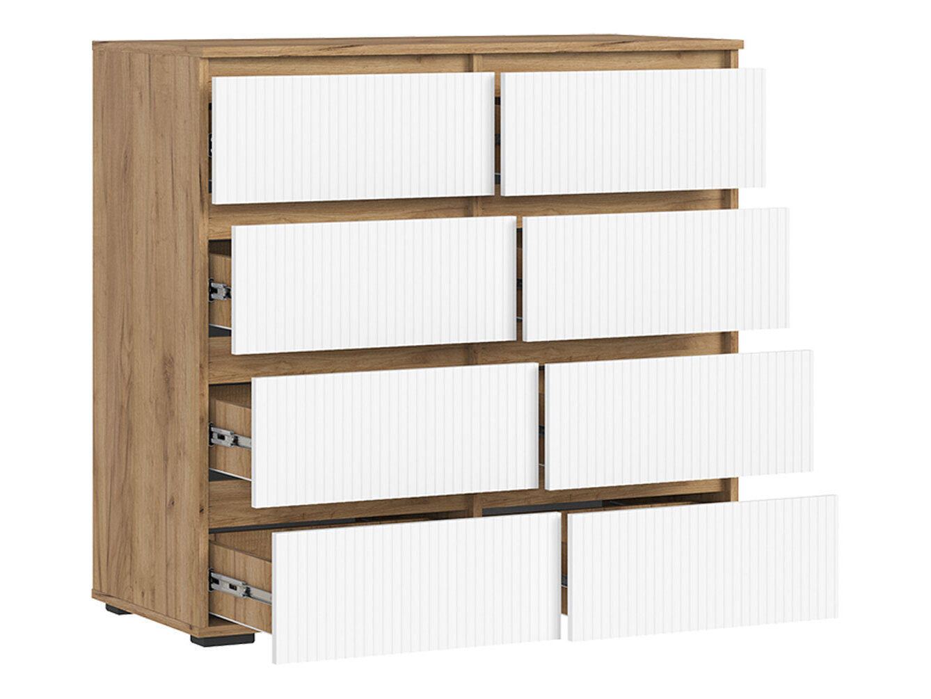 Модель максимально удобна в эксплуатации: ящики легко выдвигаются на всю глубину. Фрезеровка на фасадах выступает небольшим акцентом меблировки.